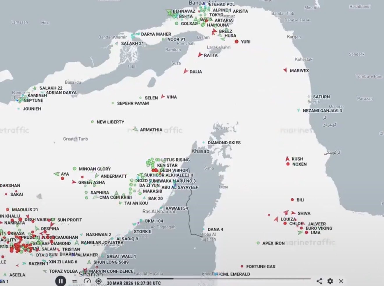 Then was the 48 hour ultimatum which got TACO’d, the Iranian policy to selectively allow a small amount of certain vessels through with permission, some escalation to power plant/desalination strikes (on Iran by US and on Kuwait by Iran), some crazy trolling by Ghalibaf on X, some OSINT rumours about another military buildup for a land invasion, then the nationwide address by Trump and letter by Pezeshkian, etc. Now the main question for this situation is if another escalation wave will come (and the degree of it) or peace talks will be happening.